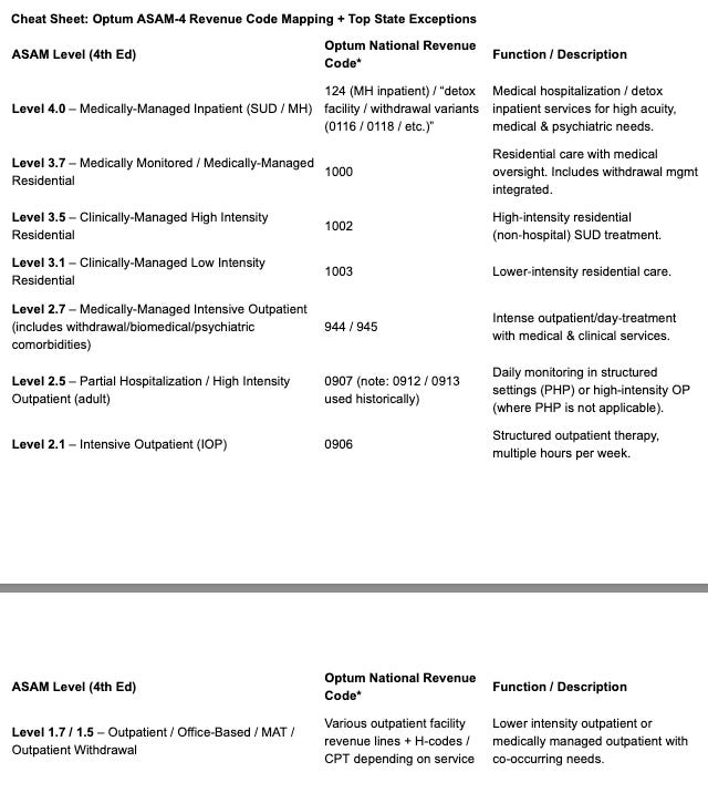 Cheat Sheet: Optum ASAM-4 Revenue Code Mapping